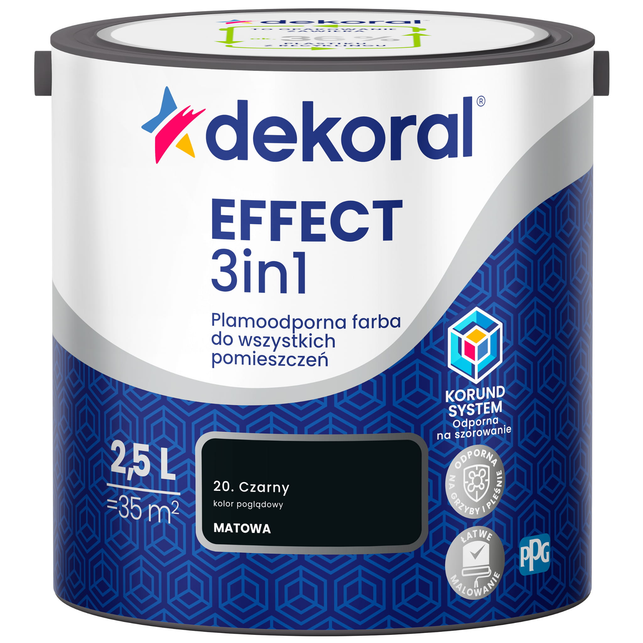 EFFECT 3in1 to plamoodporna farba rekomendowana do malowania wszystkich pomieszczeń, jak salon, sypialnia, pokój dziecięcy, korytarz, kuchnia i łazienka. Dzięki zawartości twardych jak diament kryształów korundu, posiada doskonałą odporność na zmywanie i szorowanie - bez zacieków. Dlatego umożliwia miejscowe czyszczenie stref najbardziej narażonych na zabrudzenia, jak okolice kontaktów, korytarze, dolna strefa ściany. Matowe wykończenie pozwala zamaskować niewielkie niedoskonałości podłoża. Farba silnie kryje, doskonale się rozprowadza i nie chlapie, gwarantując łatwość malowania i znakomity efekt nawet dla początkujących. Powłoka farby jest odporna na grzyby i pleśnie, dzięki czemu nadaje się także do pomieszczeń o podwyższonej wilgotności. EFFECT 3in1 to łatwy wybór, łatwe malowanie i łatwe utrzymanie ścian w czystości.